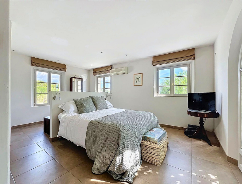Upstairs, three additional bedrooms share a bathroom, a shower room, and two separate toilets. From this level, there are sweeping views over the surrounding hills, with a glimpse of the Mediterranean Sea.