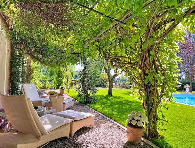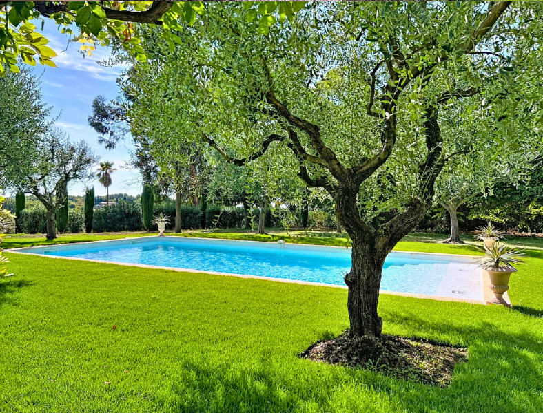 Set on a beautifully landscaped flat plot of approximately 3,100 m², the property features a charming fountain and terraces framed by olive trees, jasmine, and wisteria. A large swimming pool and a covered outdoor lounge provide the perfect setting to relax, entertain, or simply soak up the Mediterranean lifestyle.
