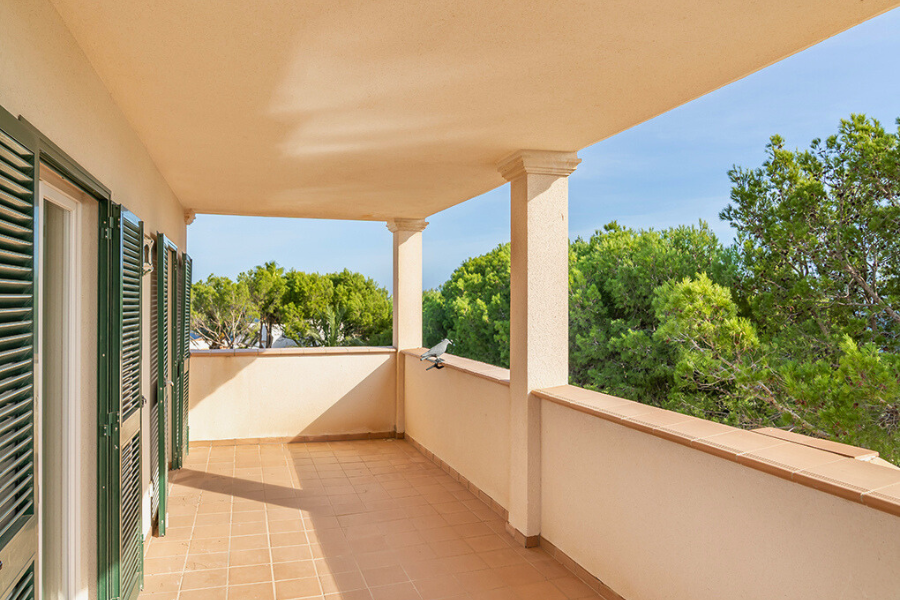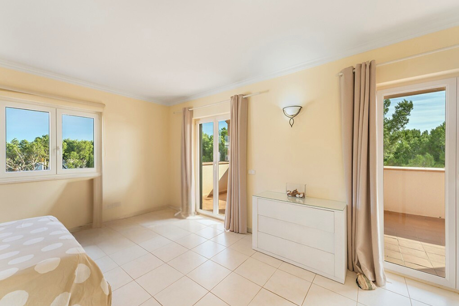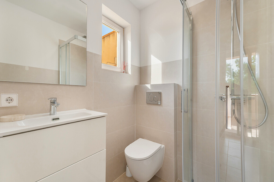 Upstairs, two bedrooms with en-suite bathrooms provide access to a sunny terrace overlooking the garden and the sea, complemented by a private sauna. The master suite occupies the top floor, with an en-suite bathroom and direct access to a spacious rooftop terrace – ideal for taking in panoramic views across Cala d’Or and the Mediterranean.